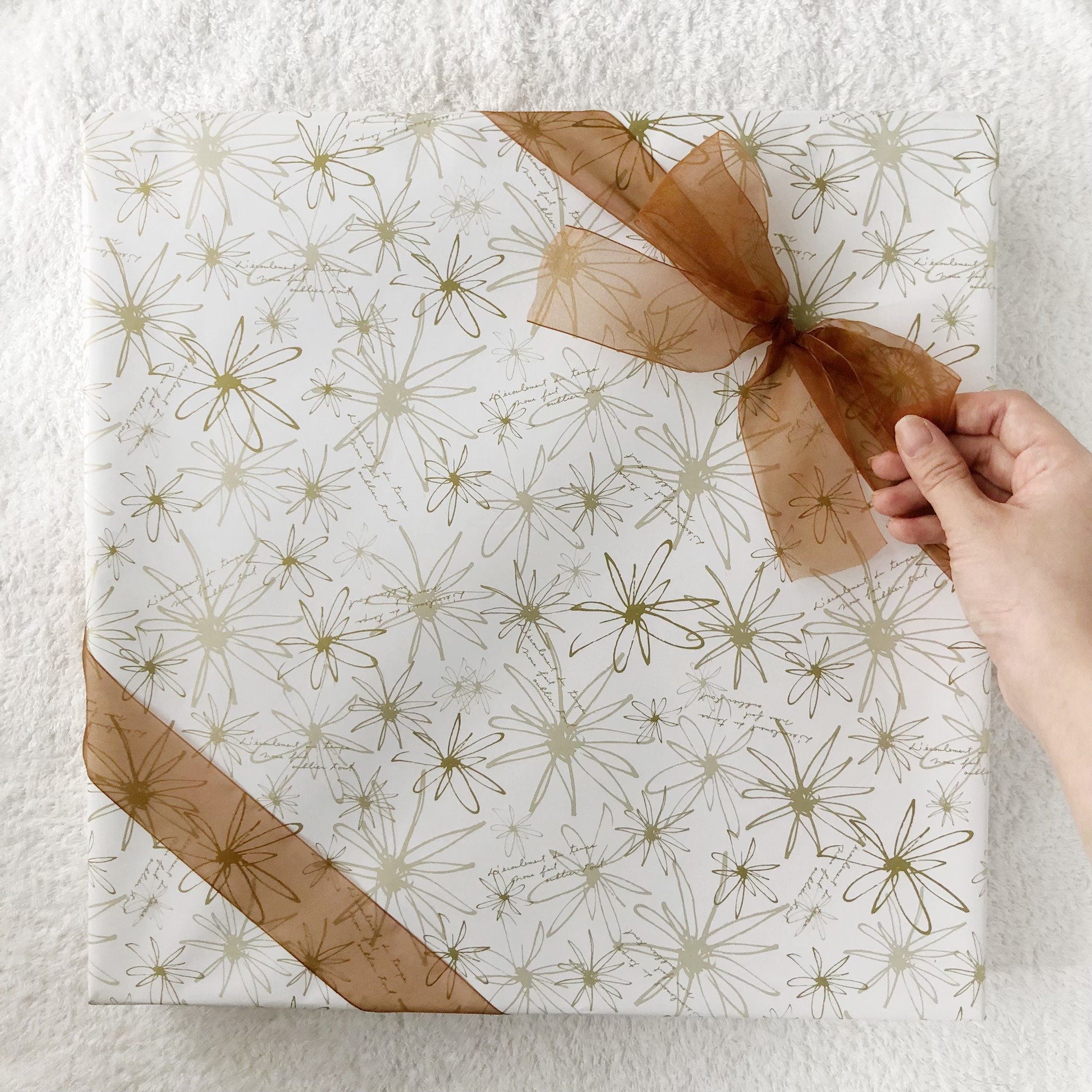 ゴールドの花柄が可愛らしくも高級感を与えてくれます。ブラウンのオーガンジーリボンで大人っぽく飾りました。