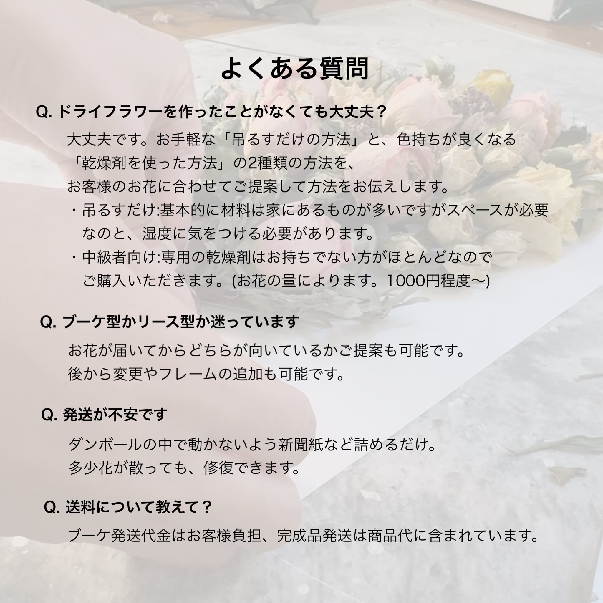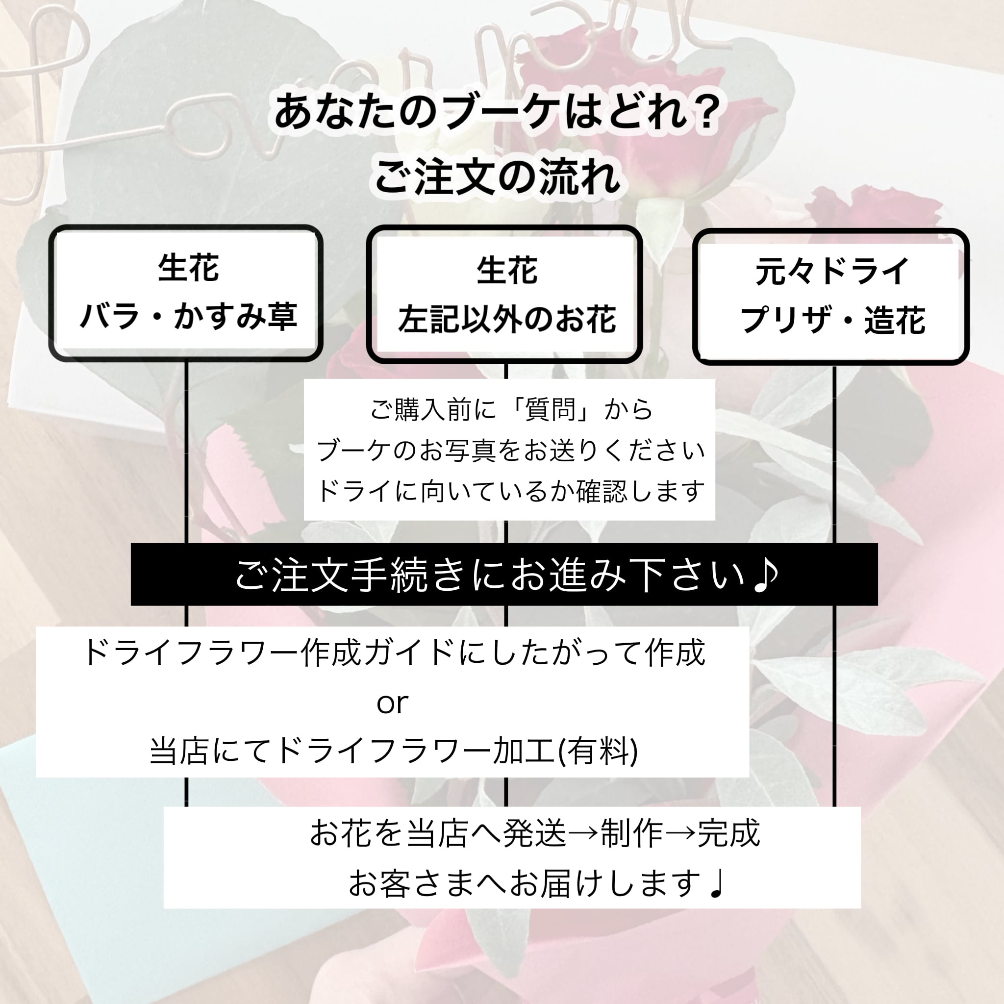 ※生花の方には、ドライ加工方法をご案内します(質問やご相談は随時可能。素早い対応を心がけています)もしくは当店でドライ加工をご依頼の場合は発送方法をお伝えします。