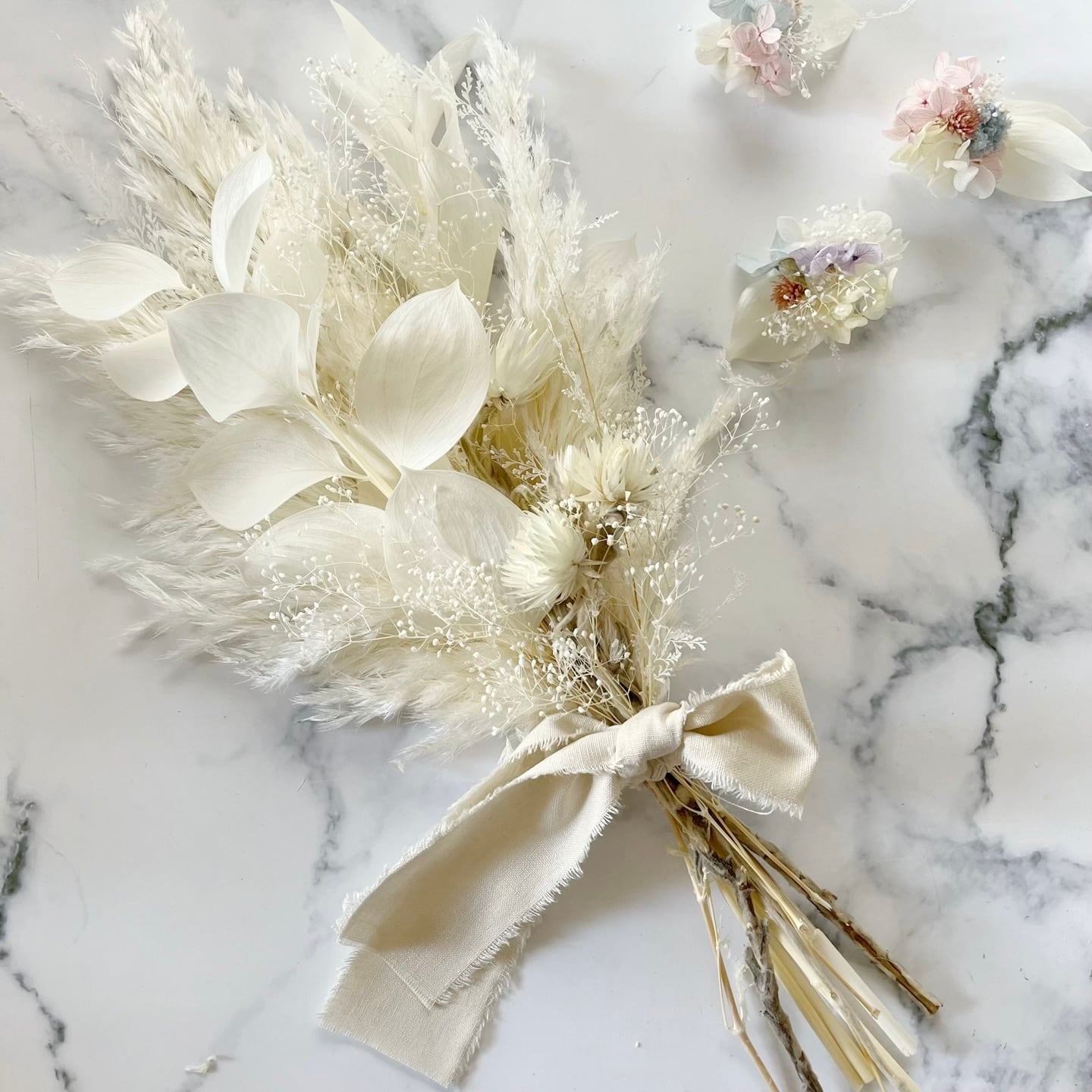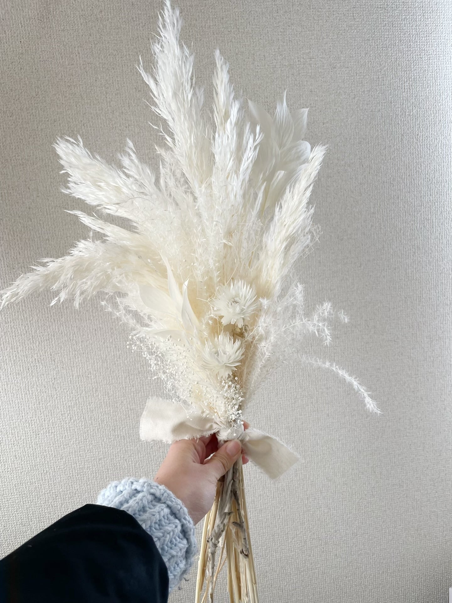 写真のようなホワイトの花材でおつくりいたします。時期によっては花材が一部変更になる場合もございます。(ふわふわが無くなるなどということはありません)