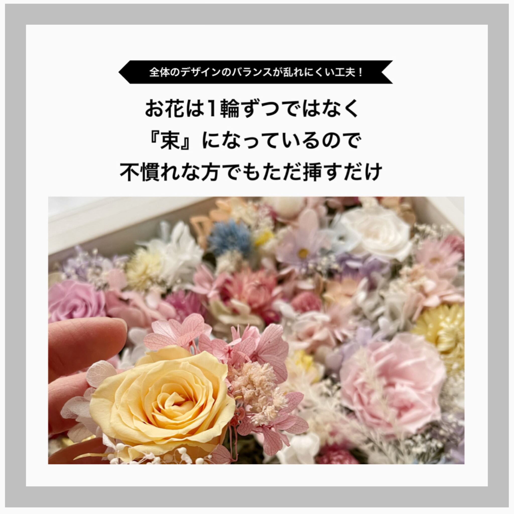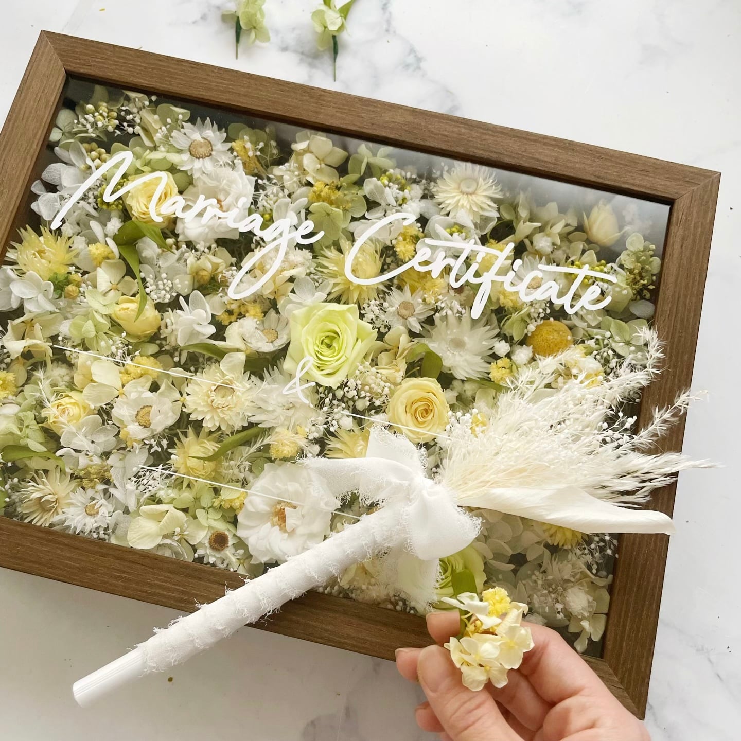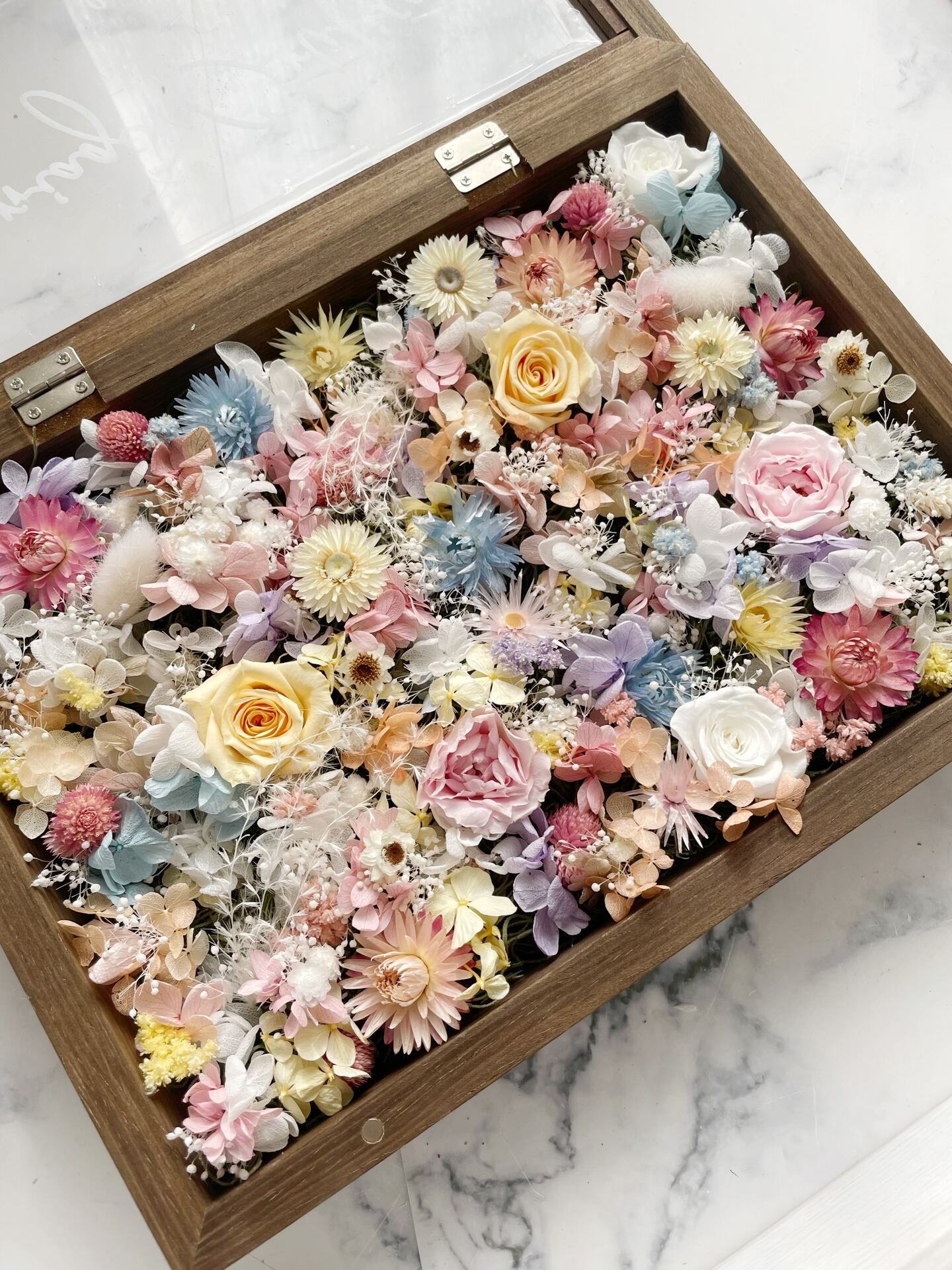 ※本物の繊細さを楽しみつつ安心して飾っていただきたいので、永く楽しめるドライフラワーとプリザーブドフラワーを使用しています。花材は基本的にお任せになります。