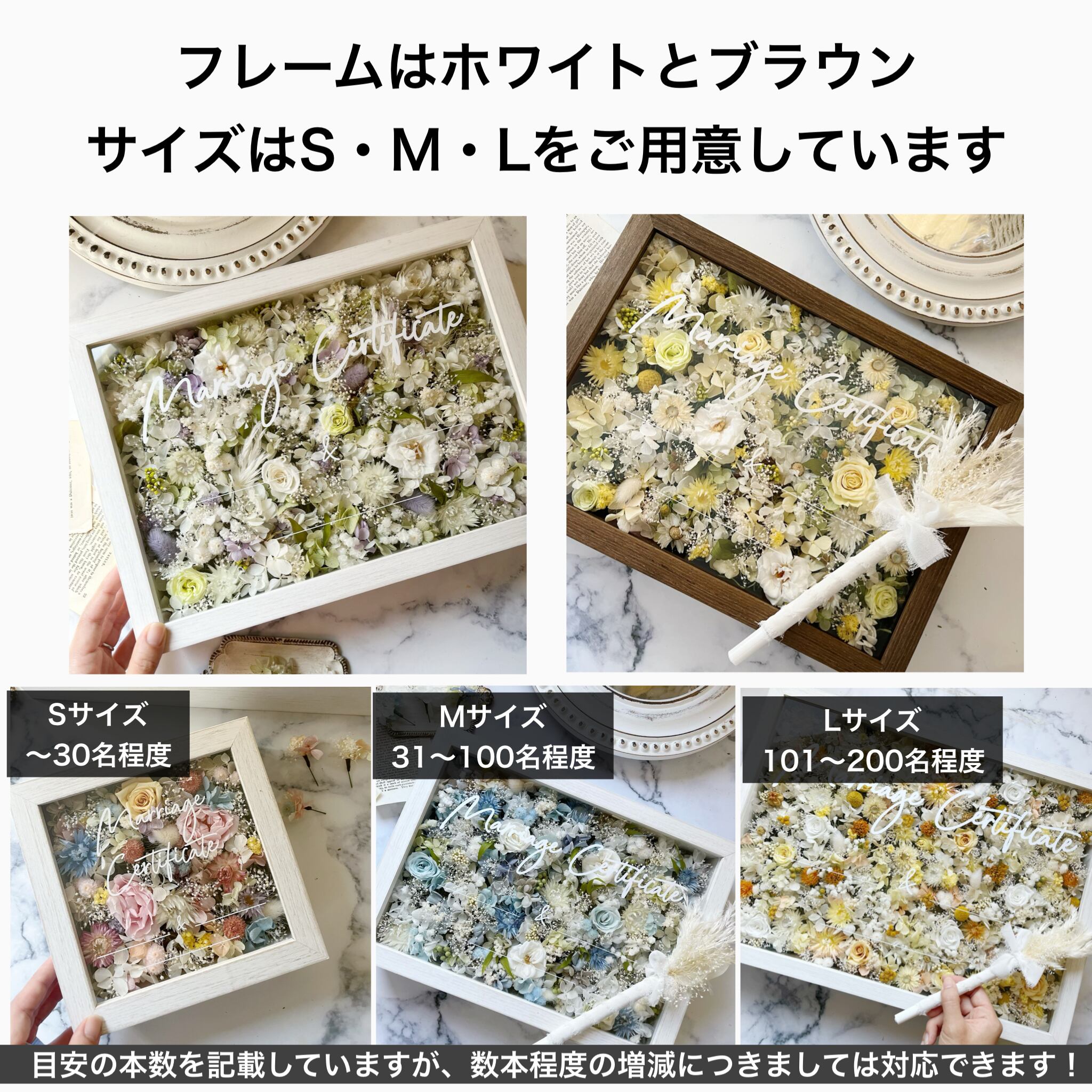 ■30人以下の場合、デザインや人数によってはゲストさんおひとりに2本ずつ挿していただくなどの変更、または、ゲストさんに挿して頂く以外に仕上げ用のパーツをお付けするかたち(1本あたりのボリュームが大きくなるほど仕上がり時にお花とお花の間に隙間が出来やすくなるため)をご提案させていただくことがあります。