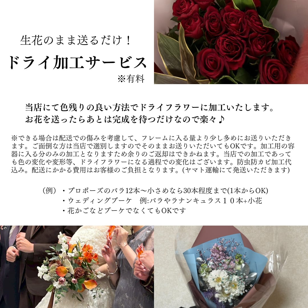※生花の方には、ドライ加工方法をご案内します(質問やご相談は随時可能。素早い対応を心がけています)もしくは当店でドライ加工をご依頼の場合は発送方法をお伝えします。