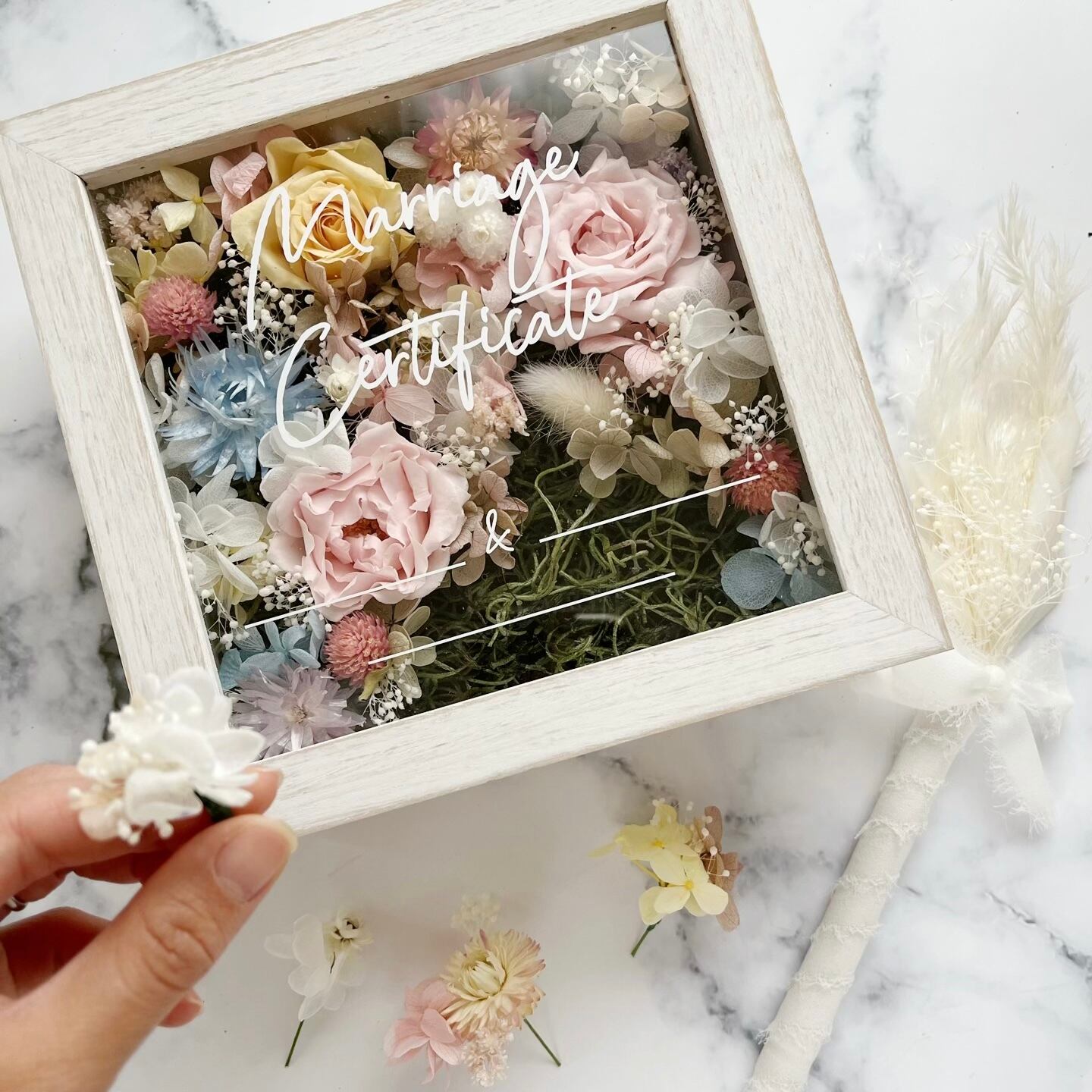 ※本物の繊細さを楽しみつつ安心して飾っていただきたいので、永く楽しめるドライフラワーとプリザーブドフラワーを使用しています。花材は基本的にお任せになります。