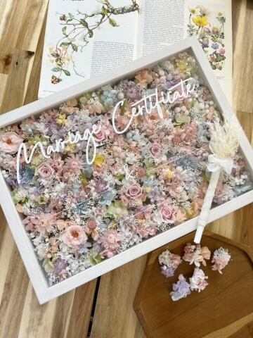 ※本物の繊細さを楽しみつつ安心して飾っていただきたいので、永く楽しめるドライフラワーとプリザーブドフラワーを使用しています。花材は基本的にお任せになります。