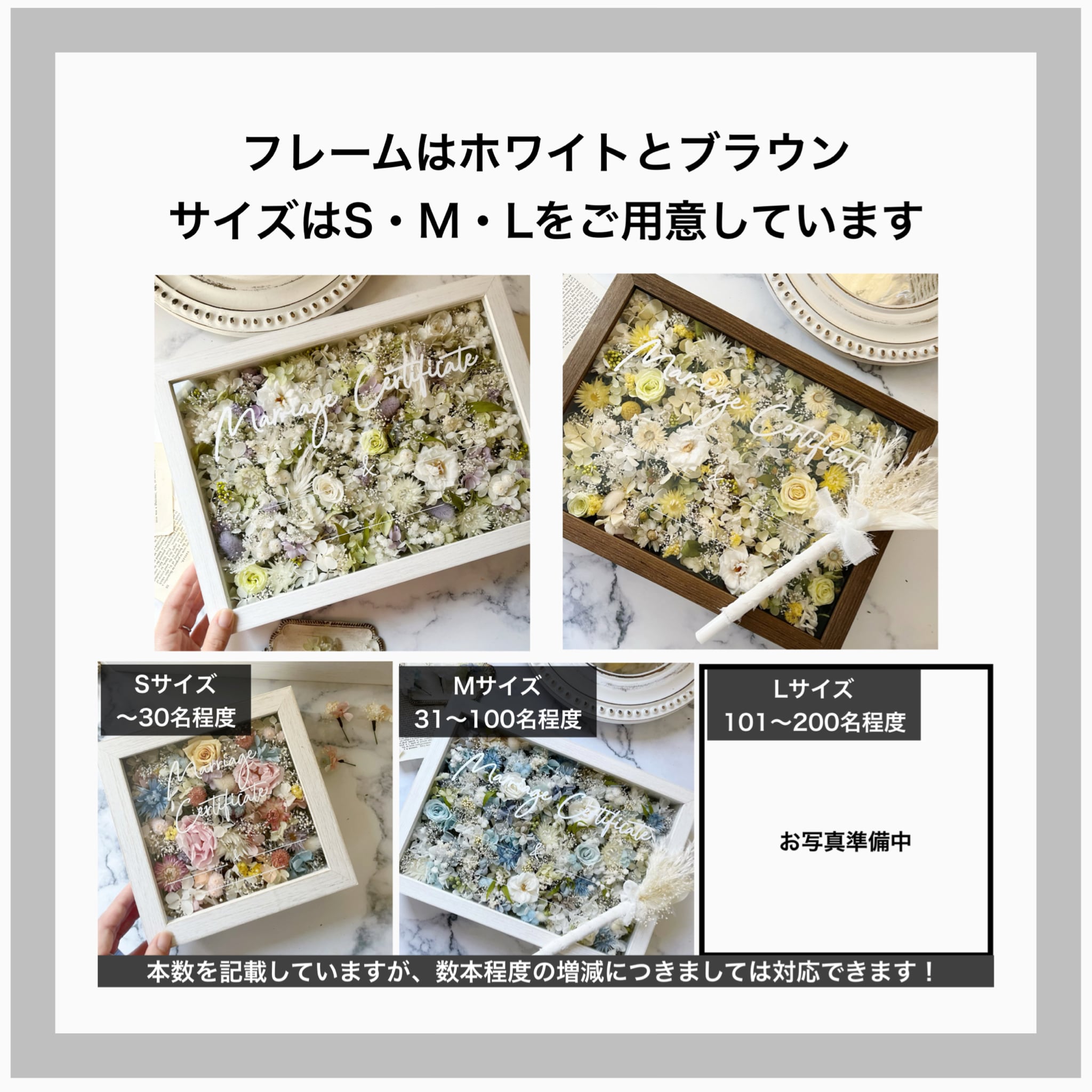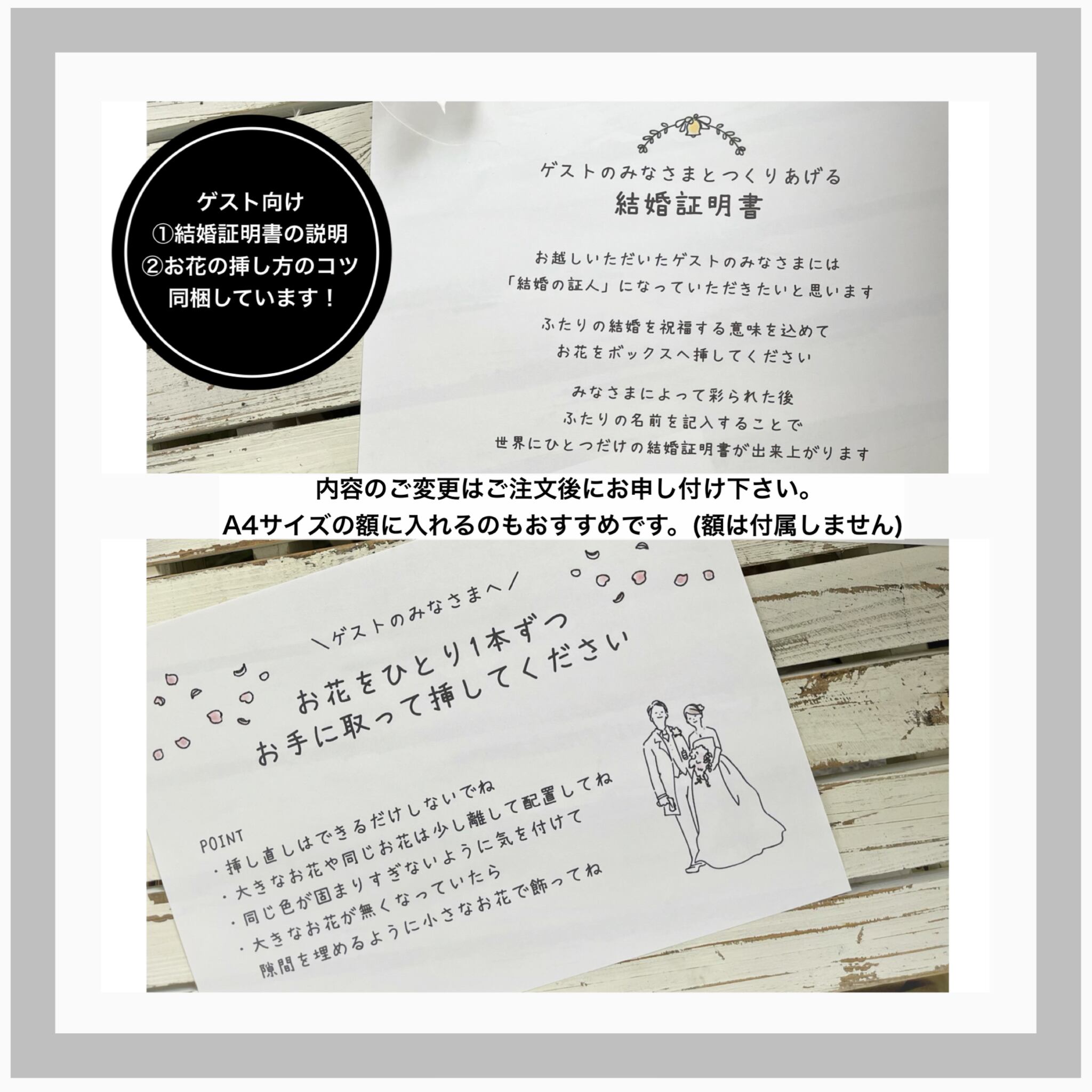 ■100人以下の場合、デザインや人数によってはゲストさんおひとりに2本ずつ挿していただくなどの変更、または、ゲストさんに挿して頂く以外に仕上げ用のパーツをお付けするかたち(1本あたりのボリュームが大きくなるほど仕上がり時にお花とお花の間に隙間が出来やすくなるため)をご提案させていただくことがあります。